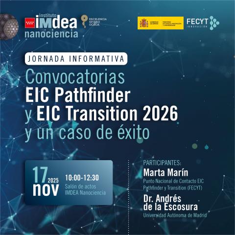 IMDEA Nanociencia organiza una jornada informativa en la que contaremos con la participación de Marta Marín, Punto Nacional de Contacto de EIC Pathfinder y Transition de la Fundación Española para la Ciencia y la Tecnología (FECYT), y también contaremos con el Dr. Andrés de la Escosura de la Universidad Autónoma de Madrid, un caso de éxito que nos compartirá su experiencia en estas convocatorias.